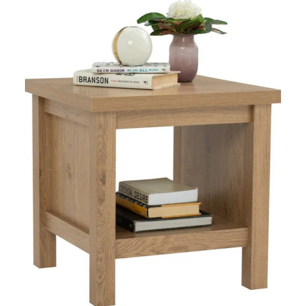 This Rhodes Side Table in oak offers a compact and elegant solution for placing next to your sofa or bed, ideal for holding your essentials within easy reach.